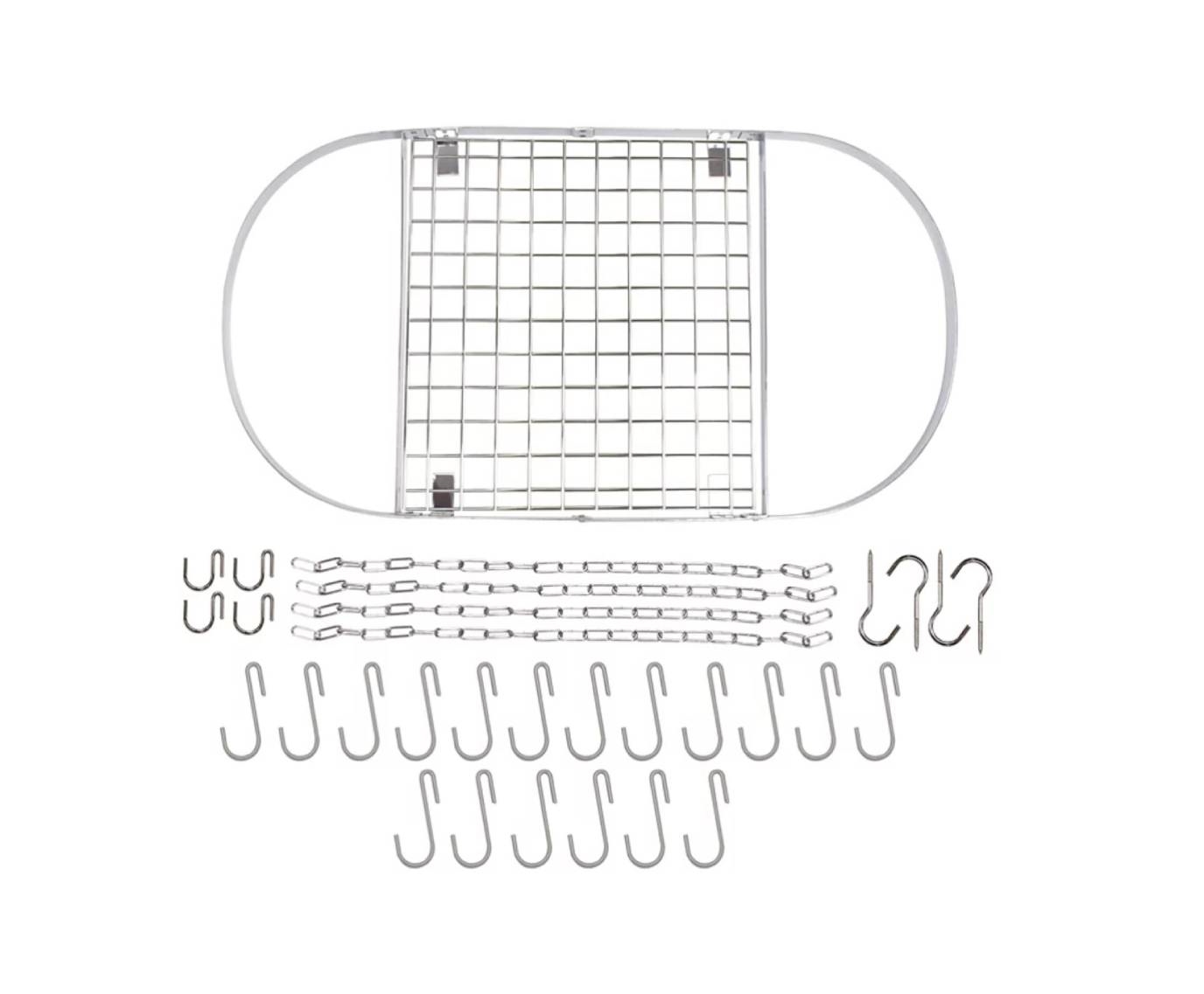 • Includes: 1 oval rack frame, 1 grid shelf, 4 lengths of chain, 4 ceiling hooks, 4 rack hooks, 12 pot hooks, 6 extra hooks